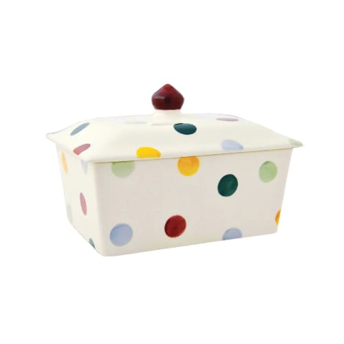Combining practicality with whimsical design, the Spotty Butter Dish keeps butter fresh while brightening up your kitchen with its distinctive polka dot pattern and handcrafted appeal.